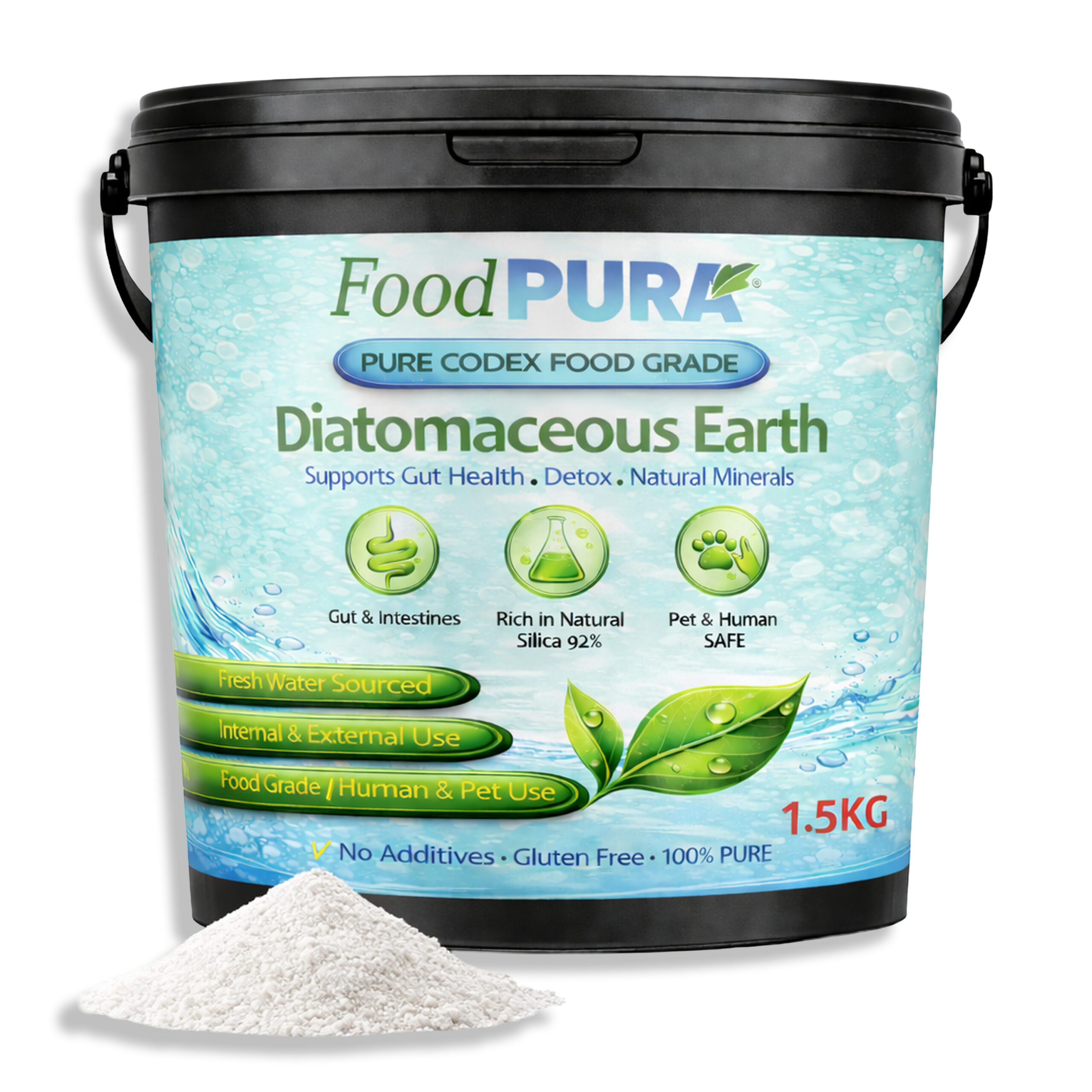 FoodPURA® FOOD Grade is a completely 100% Natural & Organic product, made from single cell algae called Diatoms. It has so many applications – from mite and internal parasite control in any animal to being suitable for Human Consumption! We have extensive knowledge and experience of this product for approaching 10 years now and have sourched here what we believe to be the Highest and Purest FOOD Grade Diatomaceous Earth anywhere.