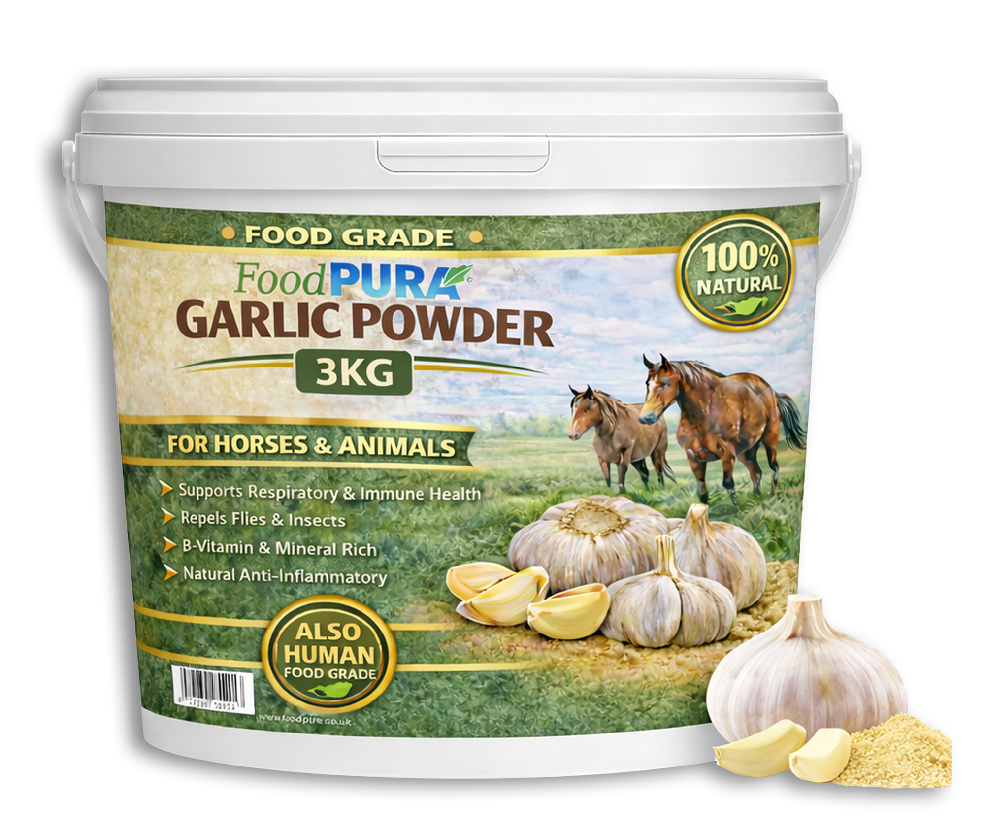 For Animal Horse & Pony use Garlic Powder can be made in to a Paste and applied to treat Mudfever, Hives, Ring Worm, Rain Scald and all types of Skin Conditions.  When added to Animal FEED its benefits include Improving Respiratory problems in horses and acting as a Fly Repellent, a Natural Antibiotic, Garlic increases general Immune activity, Help quickly Remove Toxins from the body that contribute to Poisoning, Antifungal, Antiviral and Antibacterial effects can contribute to the Healing process, Anti-Septic, Anti-Inflammatory and Antibiotic effects, reducing Blood Pressure.