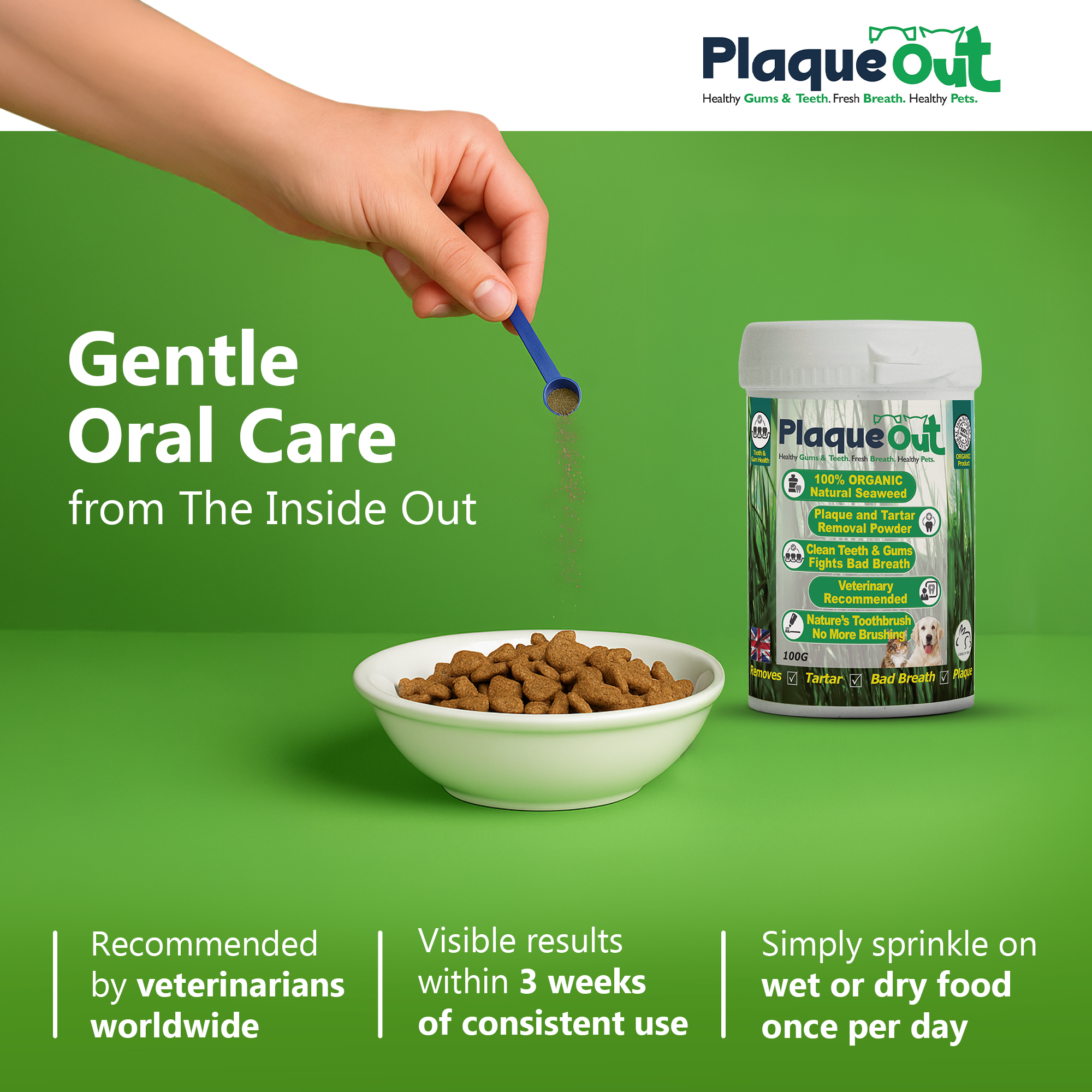 Our PLAQUE OUT for Cats & Dogs – Plaque Out is a 100% Natural and Organic product which contains 12 vitamins, 13 minerals & trace elements and is rich in natural iodine. This acts to soften and remove plaque in Cats & Dogs, the Seaweed blended ingredients has a Bio-active ingredient that works to soften and remove oral issues, save on huge vets bill and dental care! It is not applied directly on the teeth, but comes as a powder form that is sprinkled on your pet’s food. Easy to use, just add to daily feed for both cats & dogs which will help reduce the build up of Plaque & Tartar.